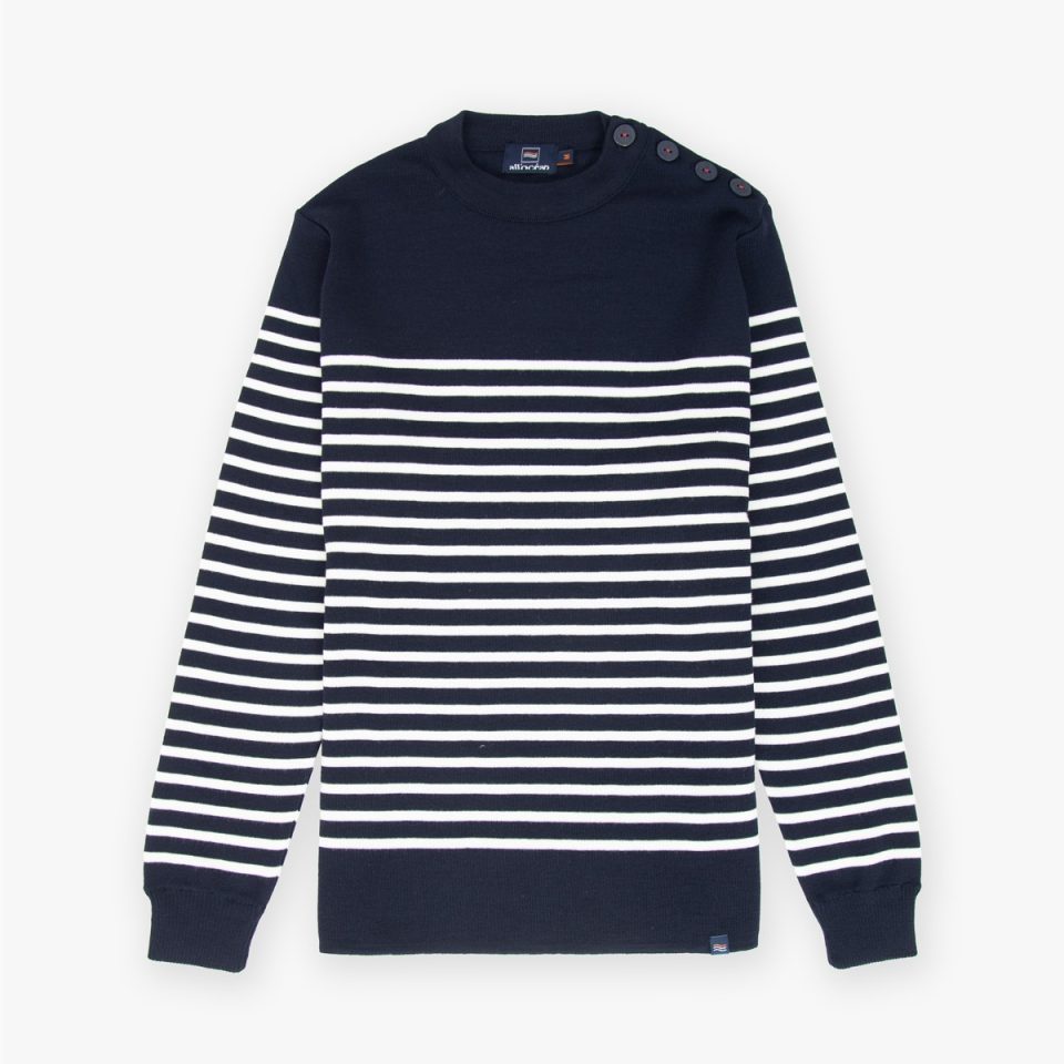 Inspiré de l'univers marin, le modèle Jersey habille les hommes en quête de douceur et d'authenticité. Tricoté en pure laine mérinos, cette fibre naturelle, souple, ultra douce et confortable fera le bonheur des plus sensibles et les préservera des variations climatiques extérieures. Ce chandail à la coupe droite ajustée sans bords côtes mettra votre silhouette en valeur. 4 boutons décorés d'une ancre marine sont cousus avec un fil rouge sur la patte d'encolure de l'épaule gauche pour vous permettre d'enfiler facilement ce pull à col rond. Le bord côtes double a été rajouté afin de renforcer le pull au niveau des poignets. Ce pull marin est le Must have de votre dressing, à porter en hiver comme en été !   Le pull marin Jersey est en 100% pure laine mérinos certifiée « Responsible Wool Standard ». Notre laine mérinos est filée et teintée par notre filateur italien partenaire depuis plus de 20 ans.