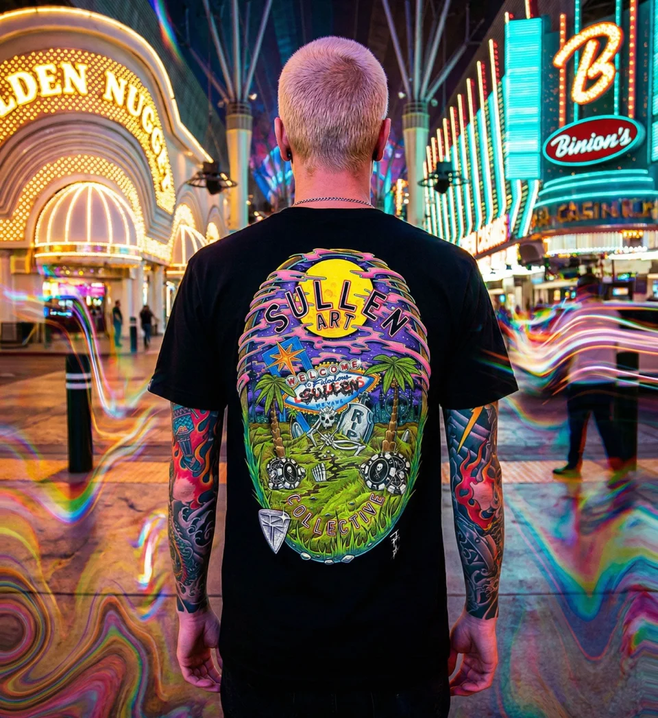 Ce t-shirt de la série Artist par @ricktrip transforme Las Vegas en un rêve psychédélique : cieux néon, palmiers, dés et crânes se fondent tous en une scène surréaliste. Imprimé sur notre t-shirt Classic Standard, il conserve une coupe familière tandis que l'œuvre vous emmène ailleurs.